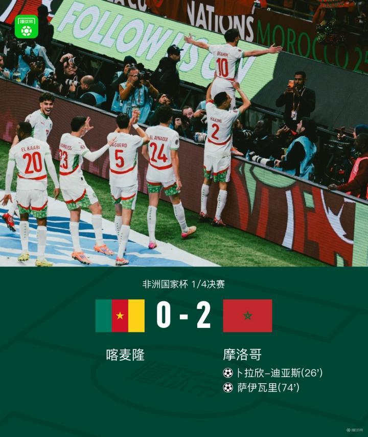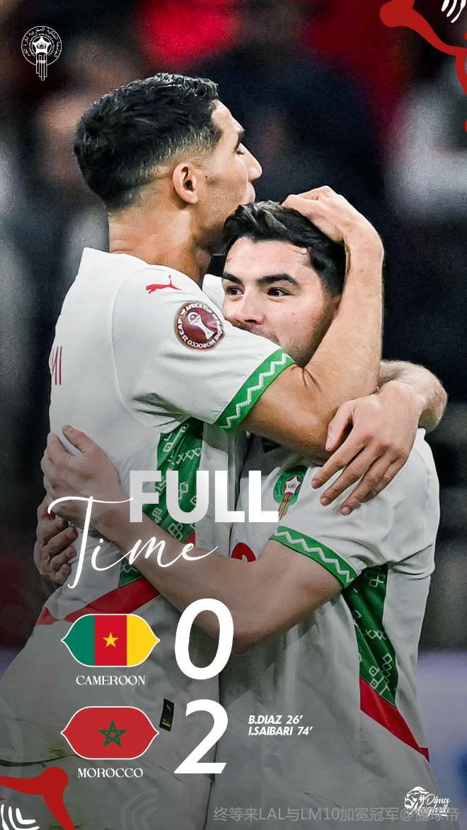 扫描下载懂球帝首页>动态> 摩洛哥2-0喀麦隆晋级四强,迪亚斯连续5场进球,萨伊瓦里建功
