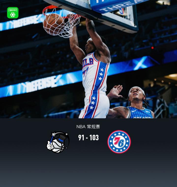 扫描下载懂球帝首页>动态> 76人103-91力克魔术,马克西29分,恩比德22+9