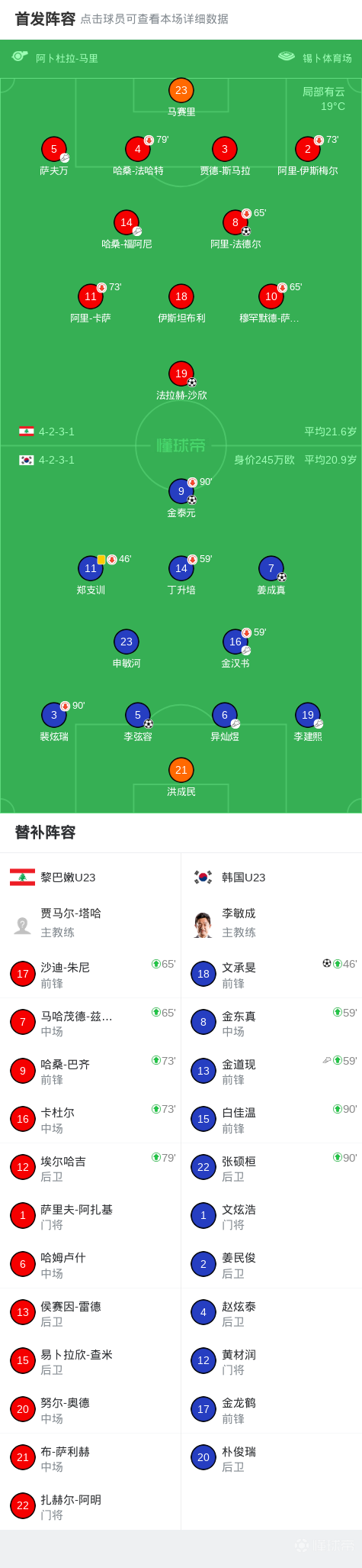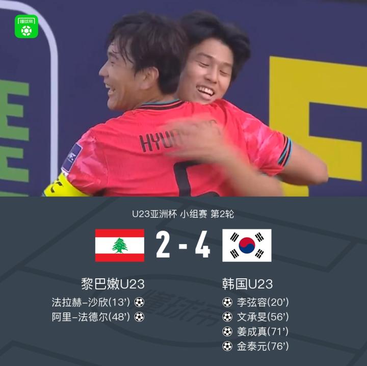 北京时间1月10日U23亚洲杯小组赛第2轮,黎巴嫩U23对阵韩国U23。黎巴嫩U23法拉赫-沙欣、阿里-法德尔分别破门。韩国U23李弦容、文承旻、姜成真、金泰元先后建功。最终韩国U23 4-2 逆转黎巴嫩U23。