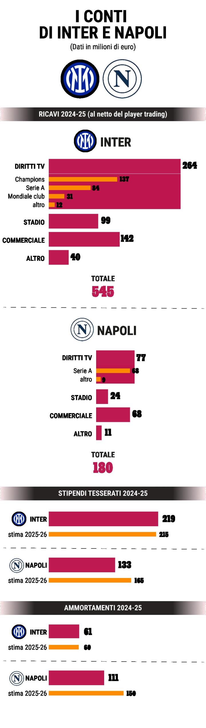 作为意甲冠军,那不勒斯从意甲联盟获得的收入,仅为欧冠亚军国际米兰从欧足联那里所得的一半。这正是两队明日对决背后,经济实力存在差距的原因之一。国际米兰拥有全球影响力,上赛季更创下了意大利足坛的收入纪录——不含球员交易收入达5.45亿欧元,其中超三分之一来自球队闯入欧冠决赛的出色表现(尽管最终不敌巴黎圣日耳曼)。