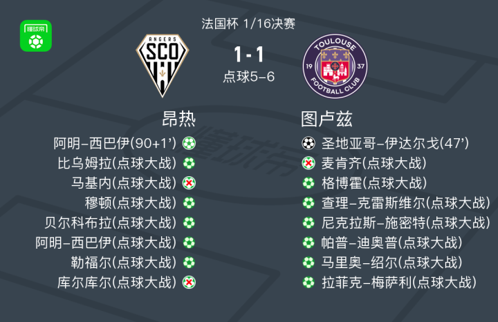 北京时间1月10日法国杯 1/16决赛,昂热对阵图卢兹。昂热阿明-西巴伊破门。图卢兹圣地亚哥-伊达尔戈破门。最终比分昂热 6-7 图卢兹。