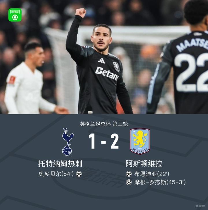 扫描下载懂球帝首页>动态> 足总杯热刺1-2遭维拉淘汰,布恩迪亚传射,罗杰斯破门
