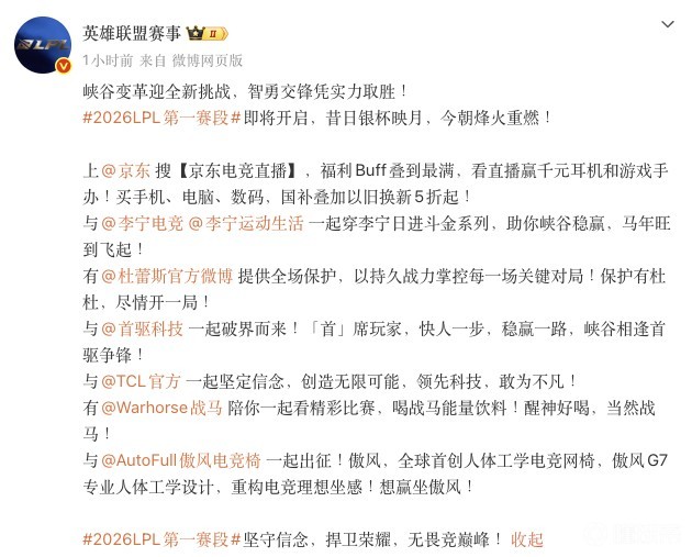 北京时间1月12日,LPL公布了2026年第一赛段的官方赞助商名单,共有7家,分别是京东/李宁/杜蕾斯/首驱/TCL/战马/傲风。