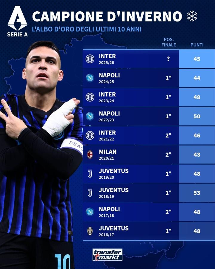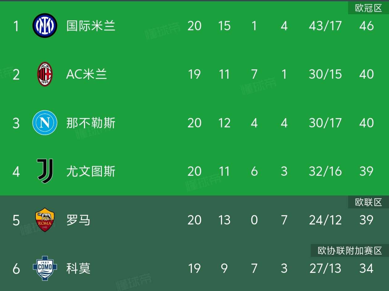 扫描下载懂球帝首页>动态> 国米45分拿到意甲半程冠军,此前9个赛季半程冠军6队最终夺冠