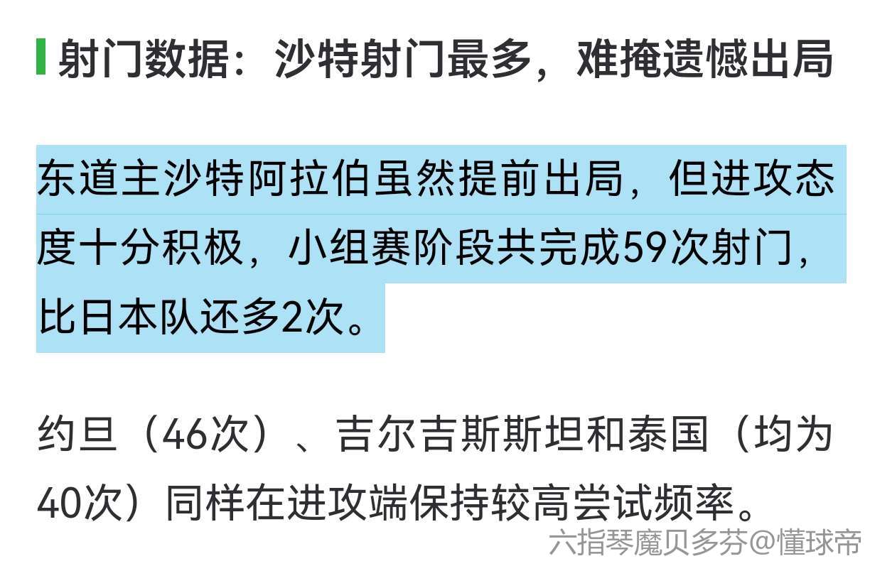 东道主沙特阿拉伯虽然提前出局,但进攻态度十分积极,小组赛阶段共完成59次射门,比日本队还多2次。
