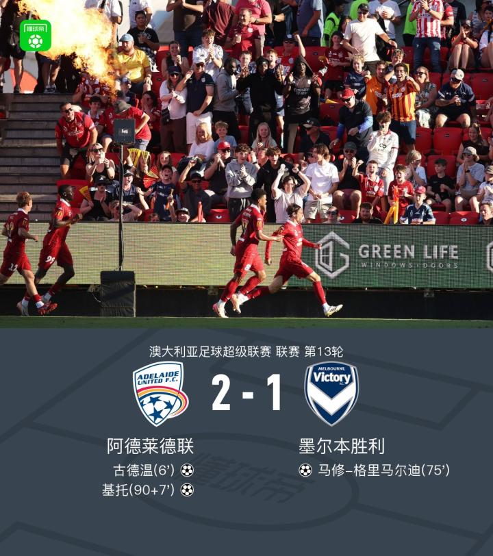 北京时间1月17日澳大利亚足球超级联赛 联赛 第13轮,阿德莱德联主场对阵墨尔本胜利。阿德莱德联古德温破门,基托破门。墨尔本胜利马修-格里马尔迪破门。最终比分阿德莱德联 2-1 墨尔本胜利。