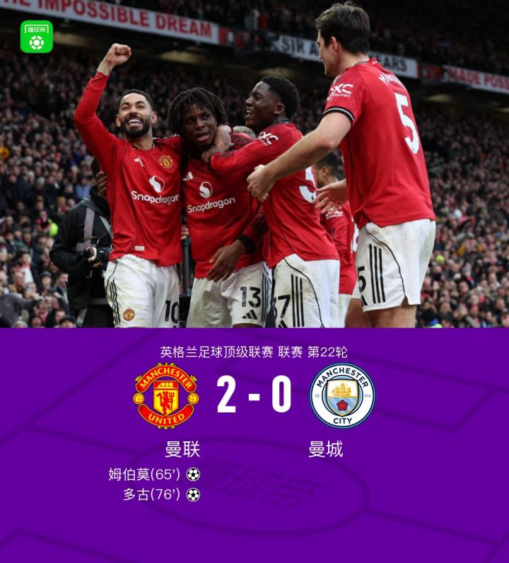 第76分钟,库尼亚下底传中,多古门前抢射破门,曼联2-0领先曼城!