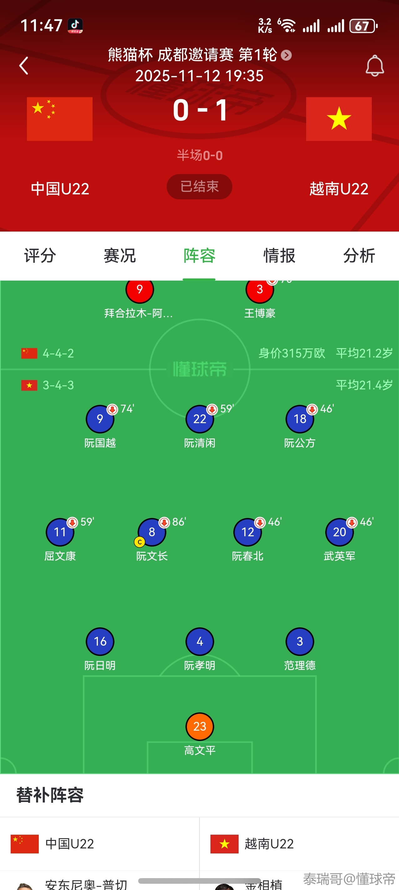 熊猫杯一球小负。越南大名单基本没变 但是首发人员变化很大