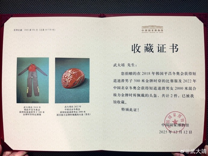 武大靖在个人社交媒体写道:“感谢国家博物馆的认可与收藏!这身比赛服浸着冰场的汗水,这顶头盔载着为国争光的信念,如今能入驻文明殿堂,与承载民族记忆的珍宝共处,是莫大的荣耀。”