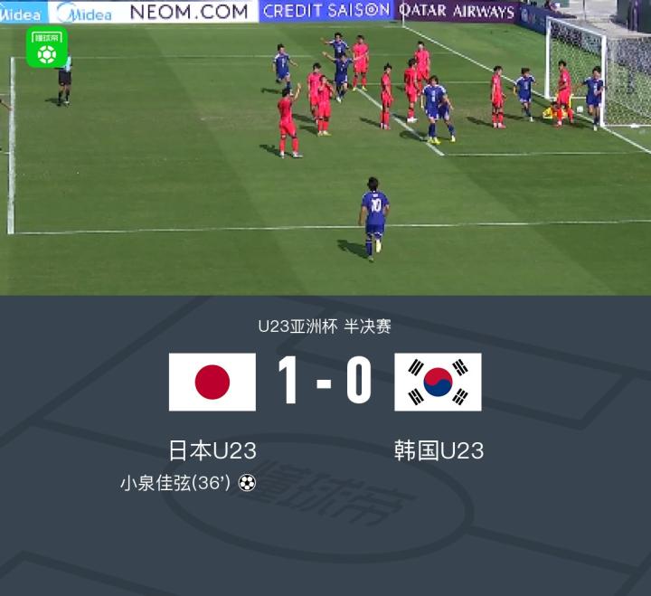 在1月20日进行的U23亚洲杯半决赛中,日本U23与韩国U23展开激烈对决。比赛中,小泉佳弦攻入全场唯一进球,张硕桓远射击中门楣。最终,日本U23以1-0战胜韩国U23,率先挺进决赛,将战中国U23和越南U23之间的胜者。