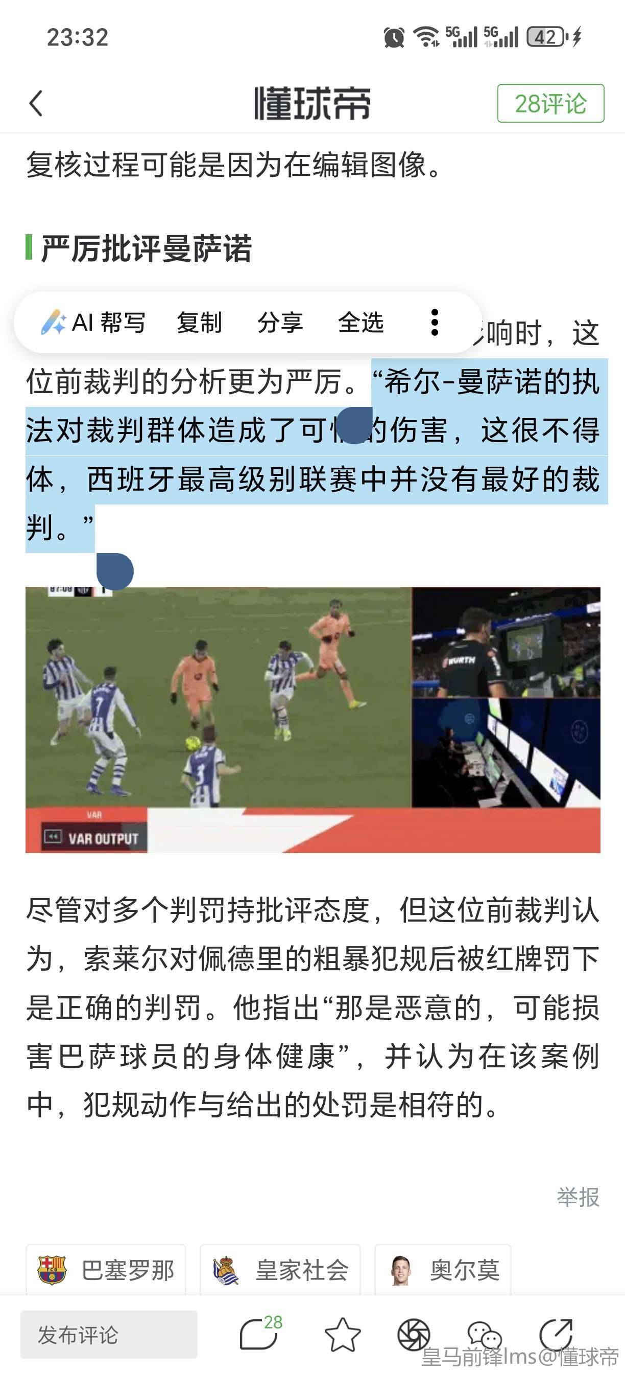 贝林厄姆绝杀变红牌的是他,这赛季红牌罚下赫伊森的也是他,西甲裁判里面对他印象最深。黑完皇马黑巴萨,这byd是不是就喜欢这种挑战权贵的感觉😅