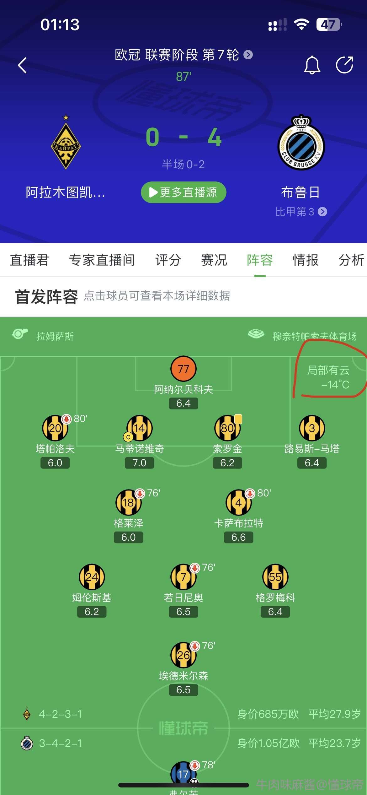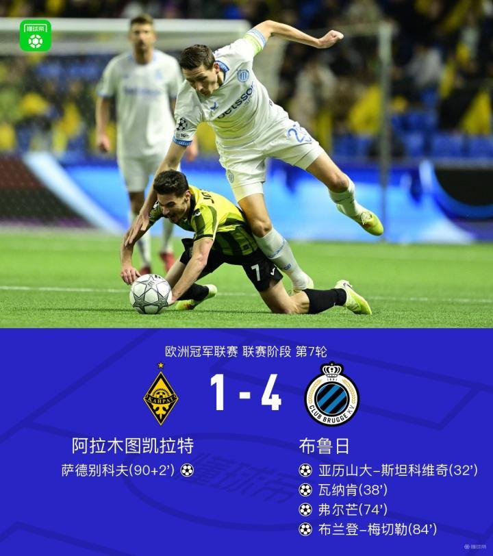 北京时间1月20日欧洲冠军联赛 联赛阶段 第7轮,阿拉木图凯拉特对阵布鲁日。上半场阿纳尔贝科夫没把球打远,小斯坦科维奇破门,之后若阿金-塞头球摆渡,瓦纳肯破门。下半场贾孔突破传中,弗尔芒破门,随后瓦纳肯挑传,梅切勒头球破门,补时阶段萨德别科夫世界波扳回一球。最终布鲁日4-1客胜凯拉特。