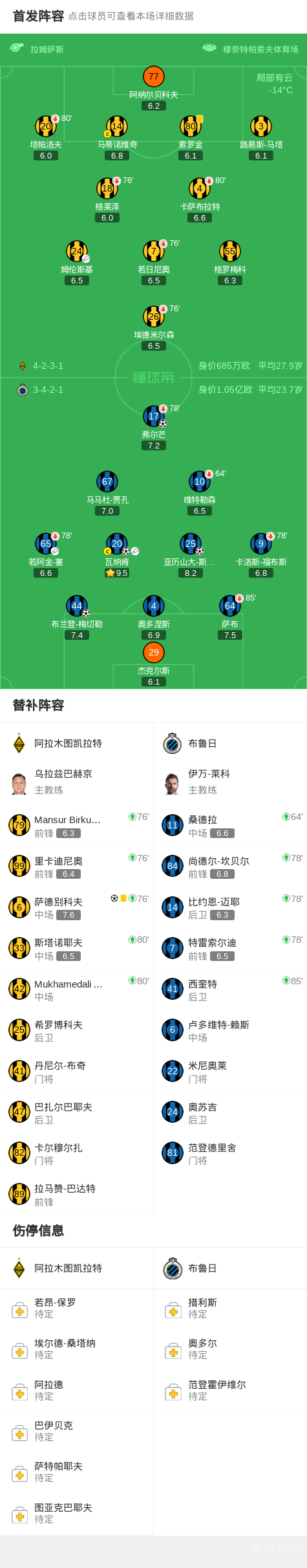 第32分钟,阿纳尔贝科夫没把球打远,小斯坦科维奇破门,布鲁日1-0领先