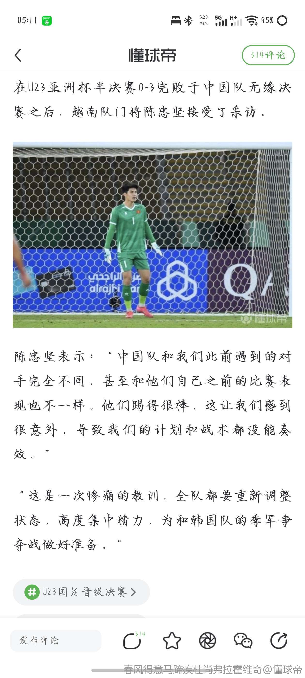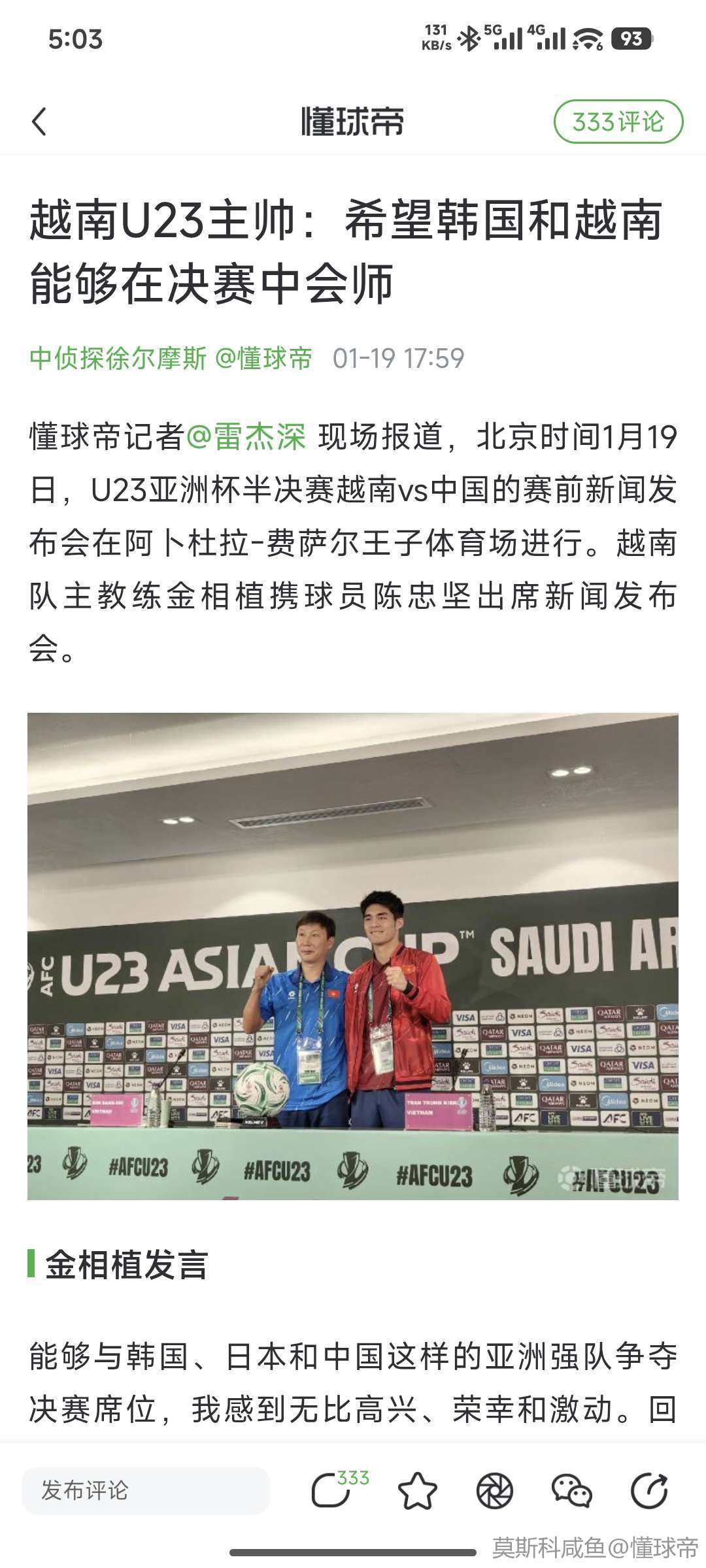 懂球帝记者@雷杰深 现场报道,北京时间1月20日,U23亚洲杯半决赛,中国队3-0战胜越南,晋级决赛。赛后,越南队主教练金相植出席新闻发布会。