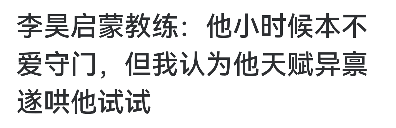 他指出,李昊在身体对抗方面仍可增强,尽管身高1米88在门将中不算特别突出,但现代足球对抗激烈,门将需要足够体格应对冲击。“他身高1米88,在现在的门将中不算特别突出,但这不是最关键的问题。我觉得他身形还可以再练得强壮一些,现代足球对抗激烈,门将也需要足够的体格来应对冲击。”