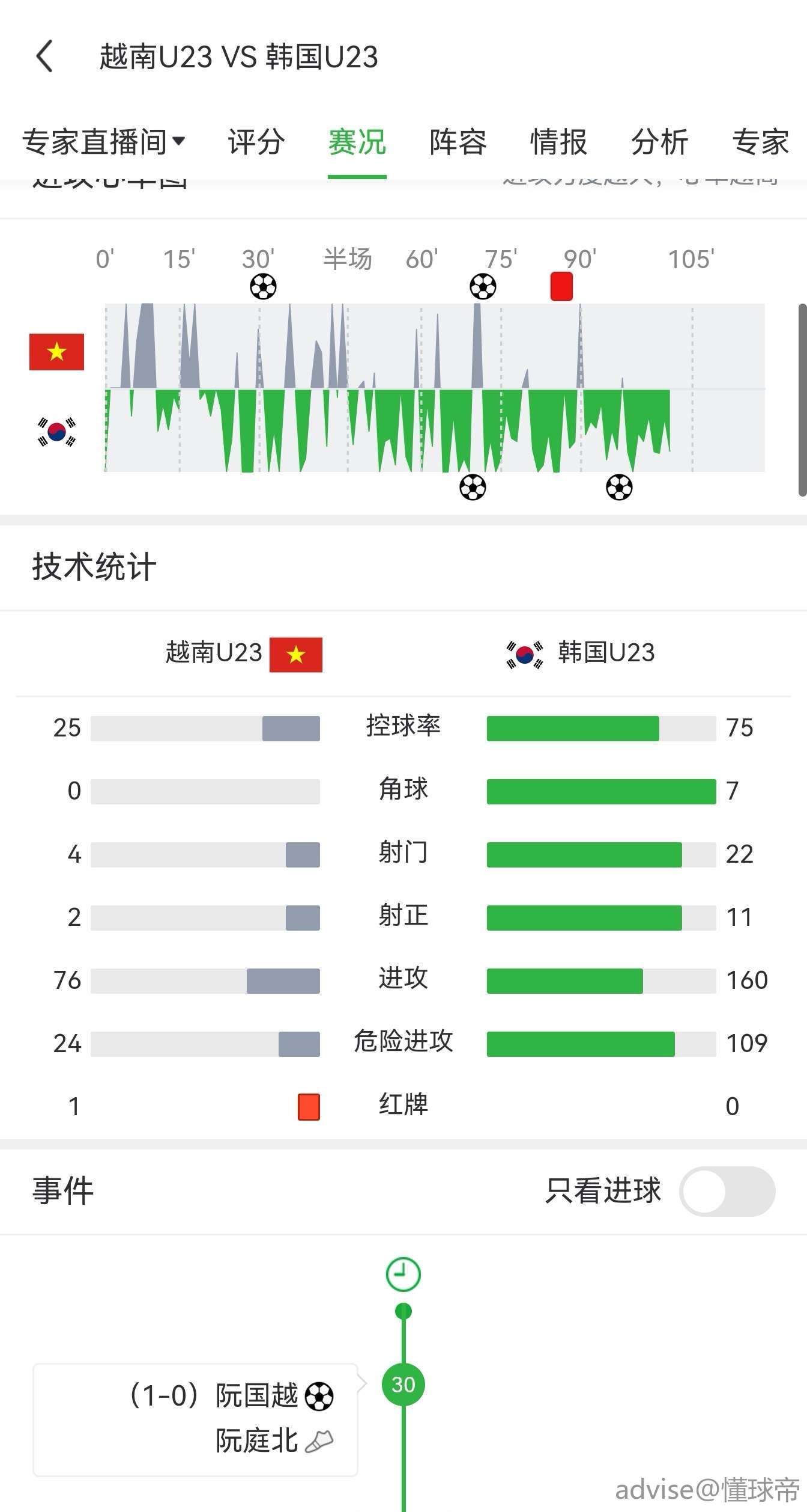 第30分钟,阮庭北助攻,阮国越劲射上角得分,U23越南1-0