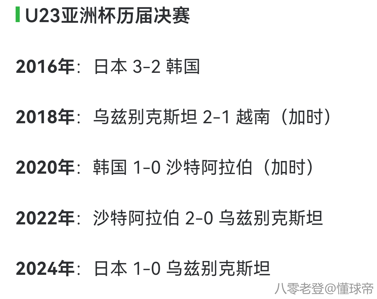 大家可以看看u23亚洲杯历史决赛对阵 有一个惊人的规律就是新一届的新球队会在决赛打败上届的冠军