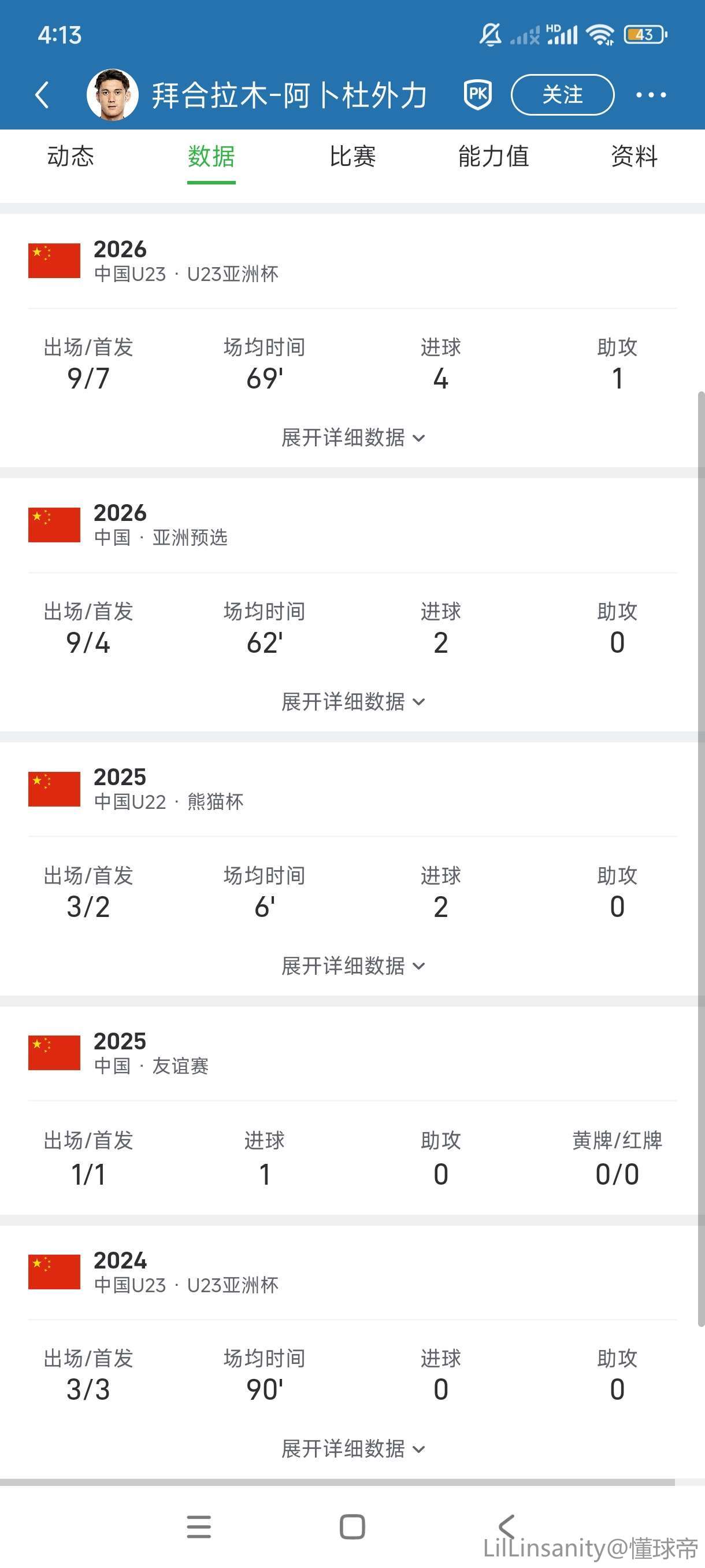 拜合拉木22岁有这样的国家队出场数据,说白了他就是个天才