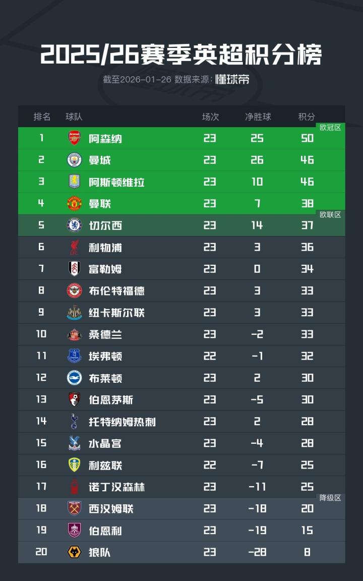 扫描下载懂球帝首页>动态> 英超积分榜:阿森纳领先优势减少至4分,曼联升至第四