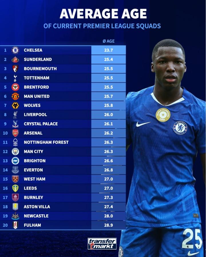 扫描下载懂球帝首页>动态> 德转统计本赛季英超20队平均年龄:切尔西23.7岁最年轻