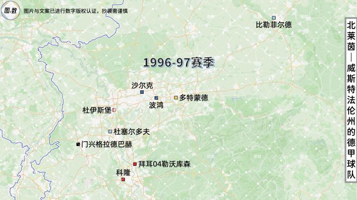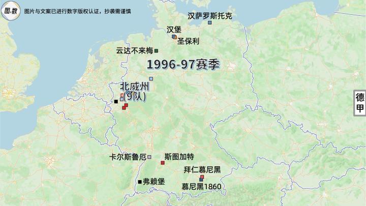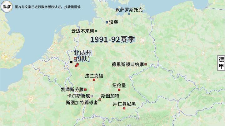 即使是德国统一后,北威州也曾两次同时拥有9支德甲球队:一次是在1991-92赛季,当时的德甲为照顾东德,临时扩充为20队;另一次是在已经恢复18队的1996-97赛季,北威州的9队是真正占据了德甲的“半壁江山”。