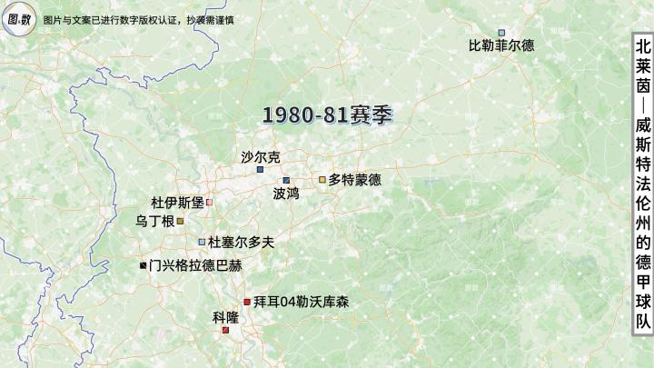在柏林墙倒塌之前的1980-81赛季,北威州有多达10支球队在参加德甲或者说西德德甲,占全国的一半儿还多(全国共18支德甲球队),他们是科隆、比勒菲尔德、勒沃库森、乌丁根、波鸿、多特蒙德、门兴格拉德巴赫、杜塞尔多夫、杜伊斯堡和沙尔克。