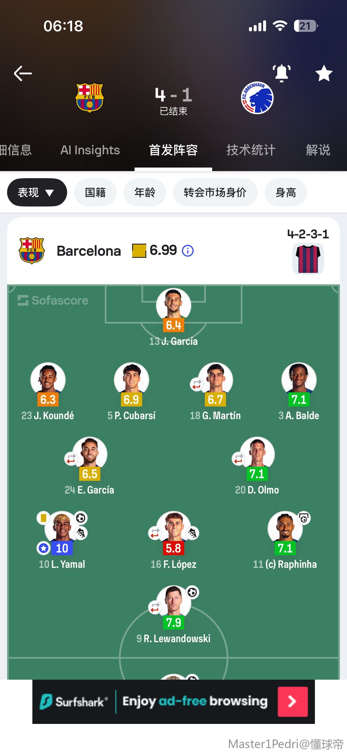 话说巴萨先让一球已经是传统了吗?不落后不会踢?上半场不忍直视,马丁和加西亚各种传球失误,还好下半场实力碾压才扳回来了,亚马尔今天发挥不错,拉师傅也可以,进了巴萨好久没进的任意球。