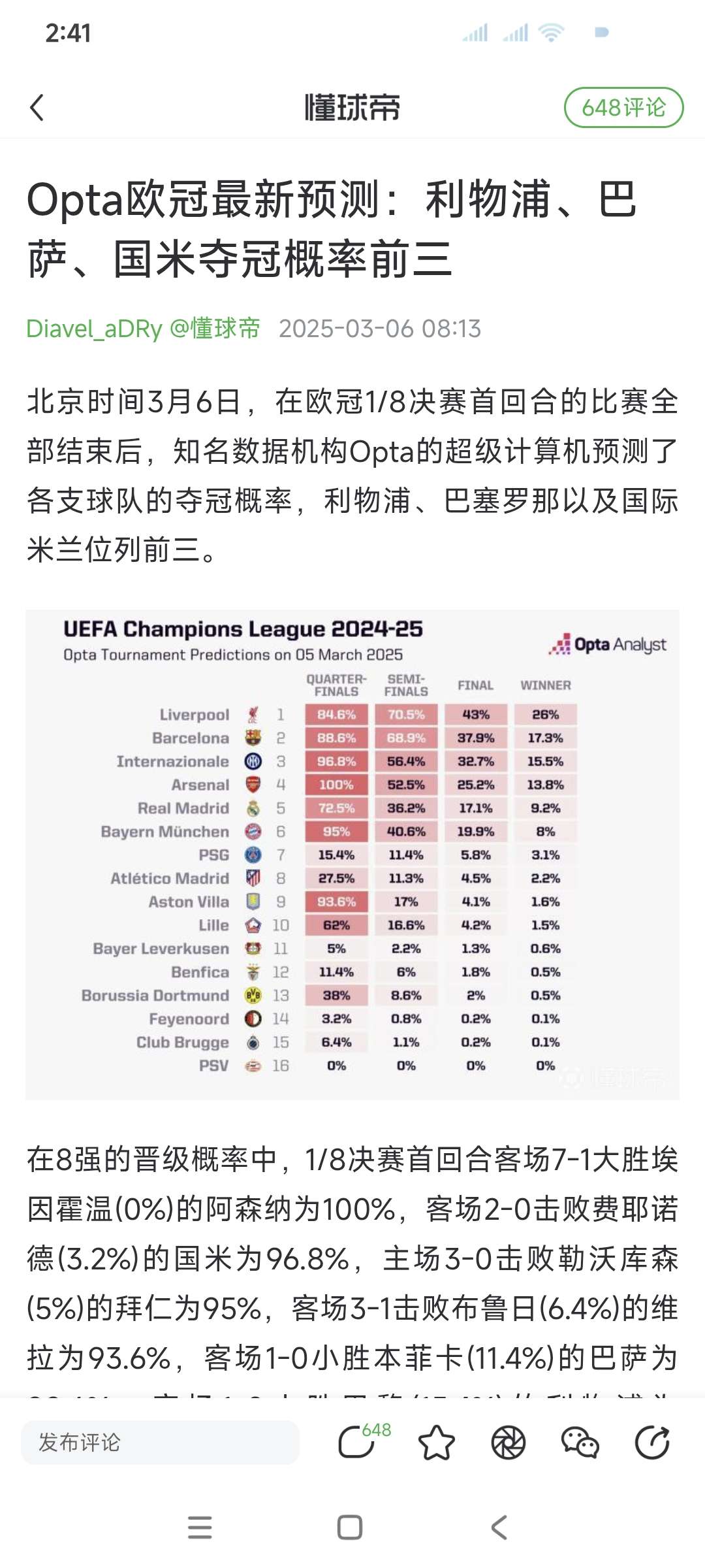 扫描下载懂球帝首页>动态> Opta更新欧冠夺冠概率:阿森纳29.8%,拜仁14.9%,曼城10.5%