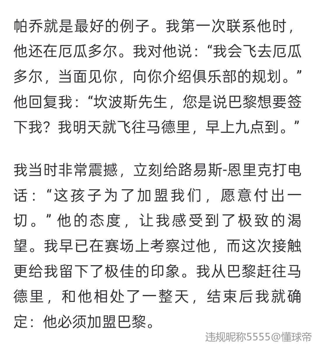 帕乔就是最好的例子。我第一次联系他时,他还在厄瓜多尔。我对他说:“我会飞去厄瓜多尔,当面见你,向你介绍俱乐部的规划。” 他回复我:“坎波斯先生,您是说巴黎想要签下我?我明天就飞往马德里,早上九点到。”