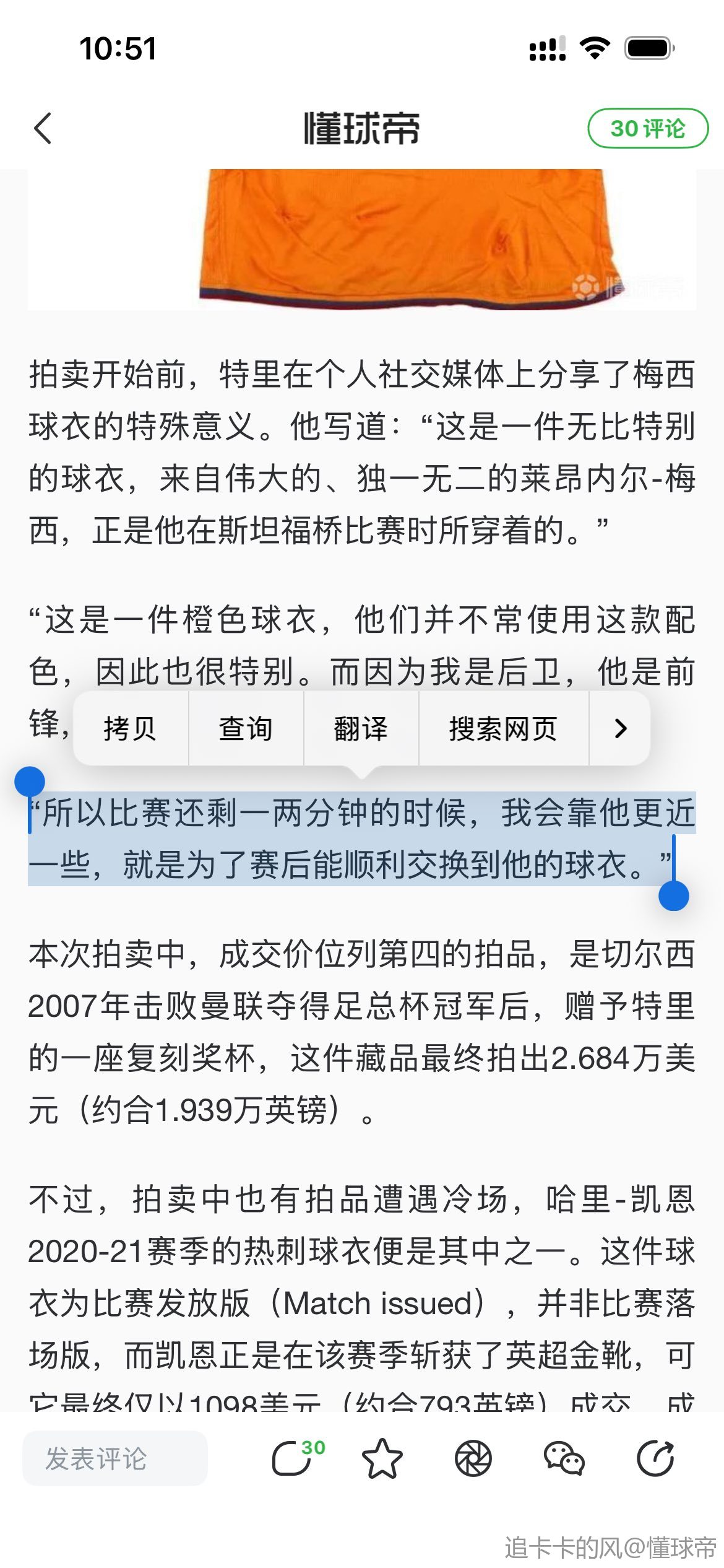 拍卖开始前,特里在个人社交媒体上分享了梅西球衣的特殊意义。他写道:“这是一件无比特别的球衣,来自伟大的、独一无二的莱昂内尔-梅西,正是他在斯坦福桥比赛时所穿着的。”