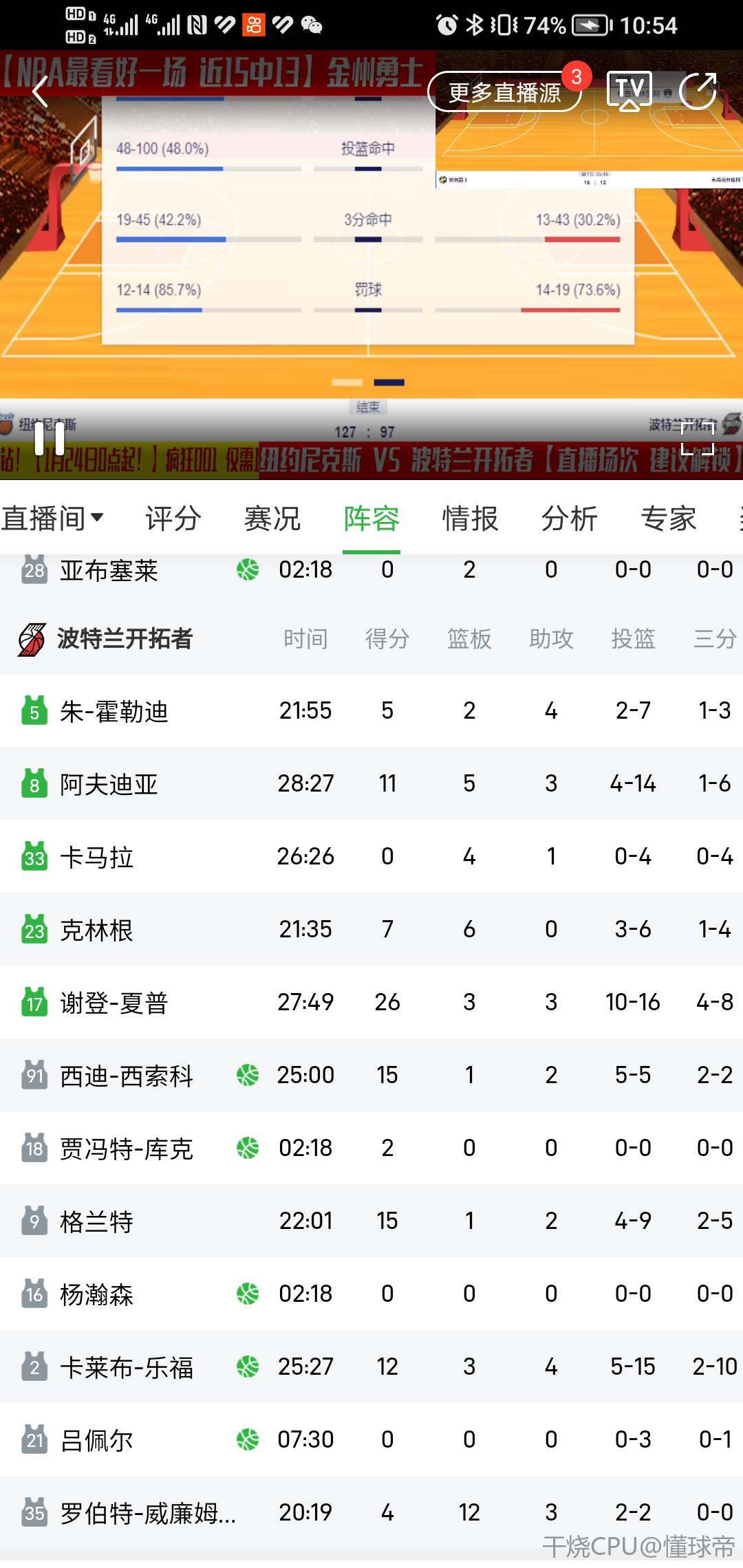 虽然今天阿夫迪亚打了,但是这几场可以看出来如果没有阿夫迪亚开拓者就是联盟倒数第一水平