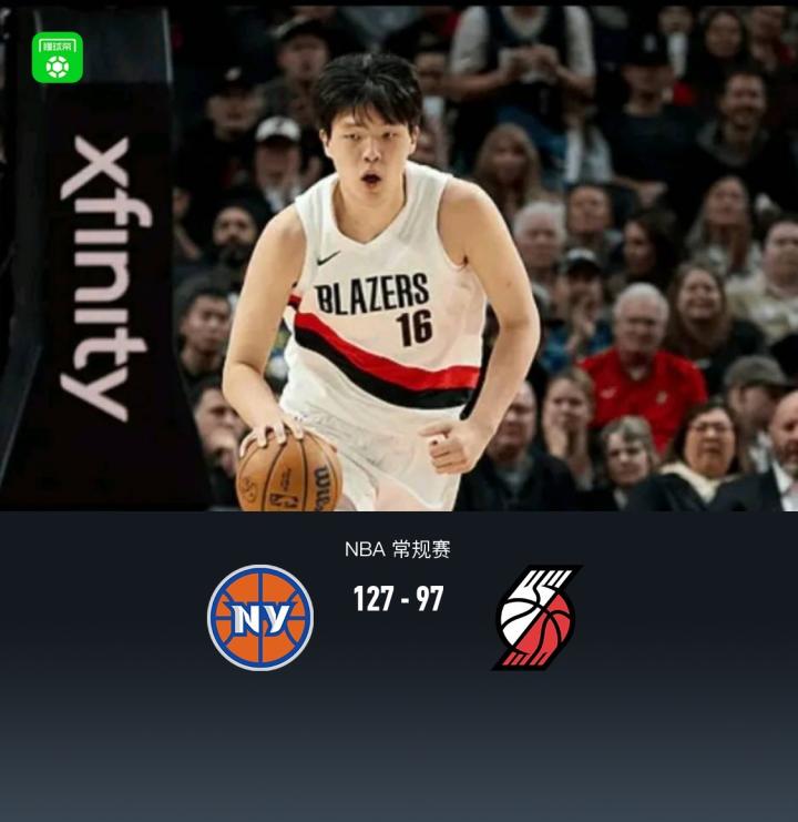 第四节,开节尼克斯多点开花命中三分,开拓者阿夫迪亚给予回应,将分差咬在20分上下,但随后阿夫迪亚下场休息,开拓者再度断电,尼克斯再度将分差拉大至30分,直至最后4分钟,双方终于彻底收兵换下主力,杨瀚森替补登场没有太多机会,无投篮出手无数据进账,全场结束,尼克斯127-97战胜开拓者。
