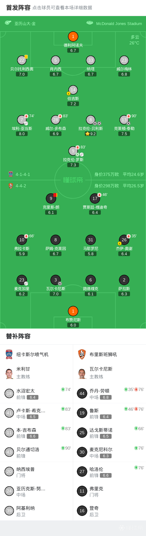 第64分钟,布赞尼斯出球失误,罗斯助攻贝利斯破门,纽卡斯尔喷气机3-1