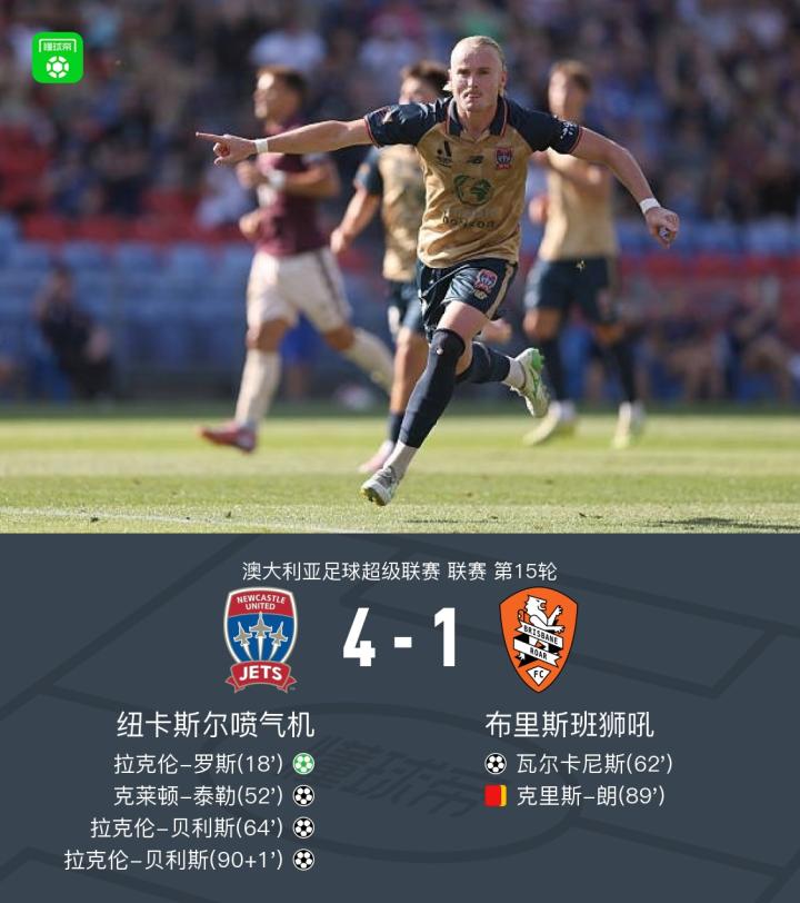 北京时间1月31日澳大利亚足球超级联赛 联赛 第15轮,纽卡斯尔喷气机主场对阵布里斯班狮吼。纽卡斯尔喷气机拉克伦-罗斯破门,克莱顿-泰勒破门,拉克伦-贝利斯梅开二度。布里斯班狮吼瓦尔卡尼斯破门。最终比分纽卡斯尔喷气机 4-1 布里斯班狮吼。