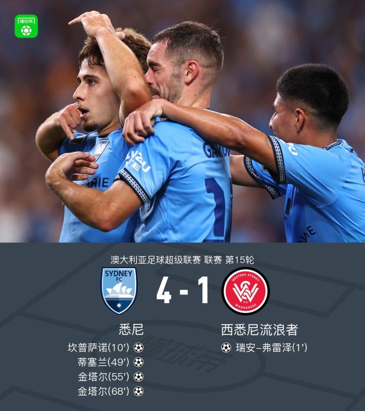 北京时间1月31日澳大利亚足球超级联赛 联赛 第15轮,悉尼主场对阵西悉尼流浪者。悉尼坎普萨诺破门,蒂塞兰破门,金塔尔梅开二度。西悉尼流浪者瑞安-弗雷泽破门。最终比分悉尼 4-1 西悉尼流浪者。