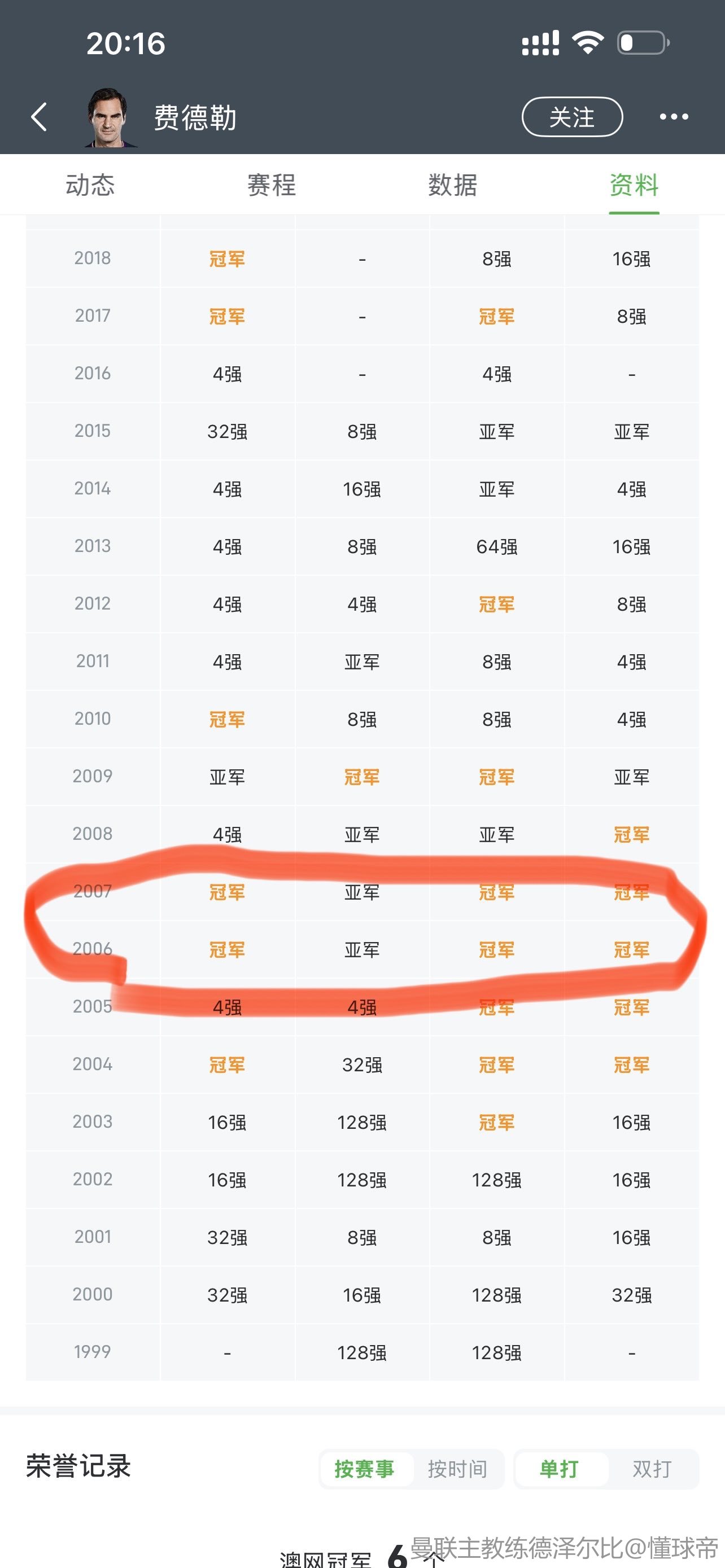 难以想象费德勒的极端垄断,居然只有一次全满贯,幸好09年拿了法网,红土之王给了网球之王一个机会
