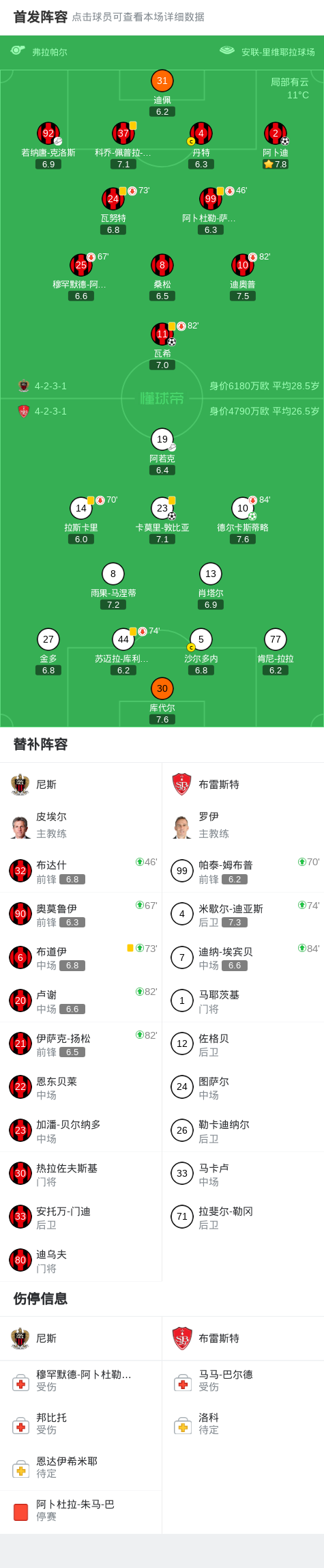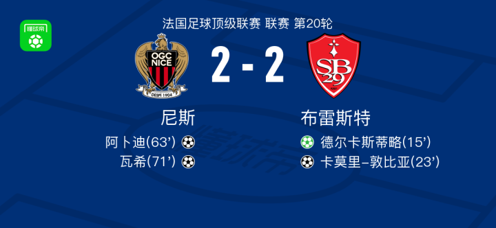 北京时间2月2日法国足球顶级联赛 联赛 第20轮,尼斯主场对阵布雷斯特。尼斯阿卜迪破门,瓦希破门。布雷斯特德尔卡斯蒂略破门,卡莫里-敦比亚破门。最终比分尼斯 2-2 布雷斯特。