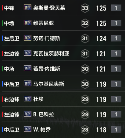 巴黎在2025年横扫欧洲,拿下了欧冠在内的多项冠军,许多球员都有着很好表现。在26TY赛季,巴黎一众现役球员入围,是26TY赛季出卡最多的俱乐部。