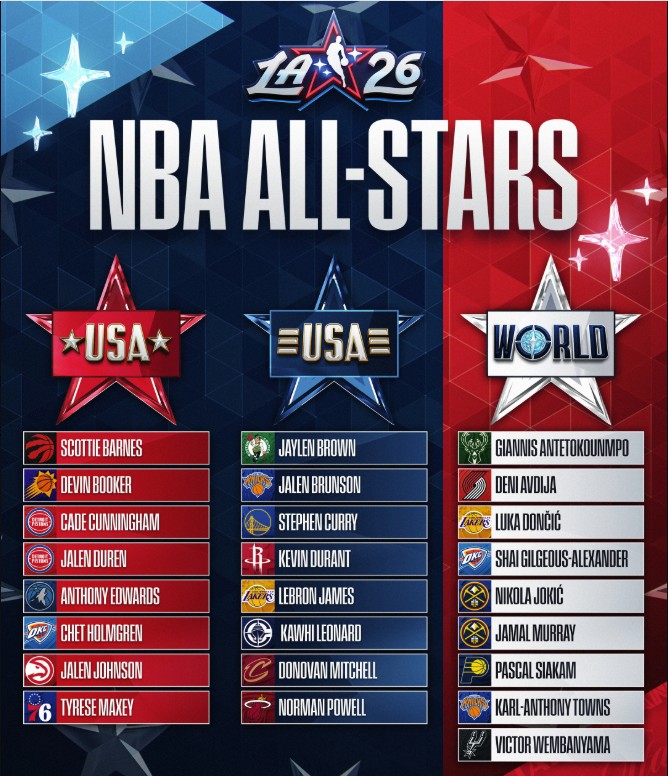 扫描下载懂球帝首页>动态> NBA全明星分组:詹杜库同属美国条纹队,唐斯划归世界队