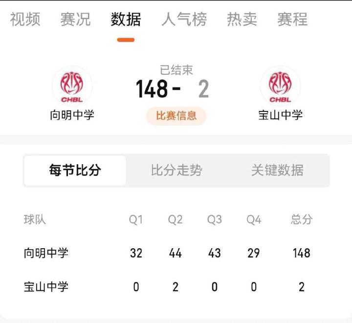 在女子组淘汰赛向明中学对阵宝山中学的比赛中,向明中学以148-2的比分狂胜对手,宝山中学只在第二节拿到2分。