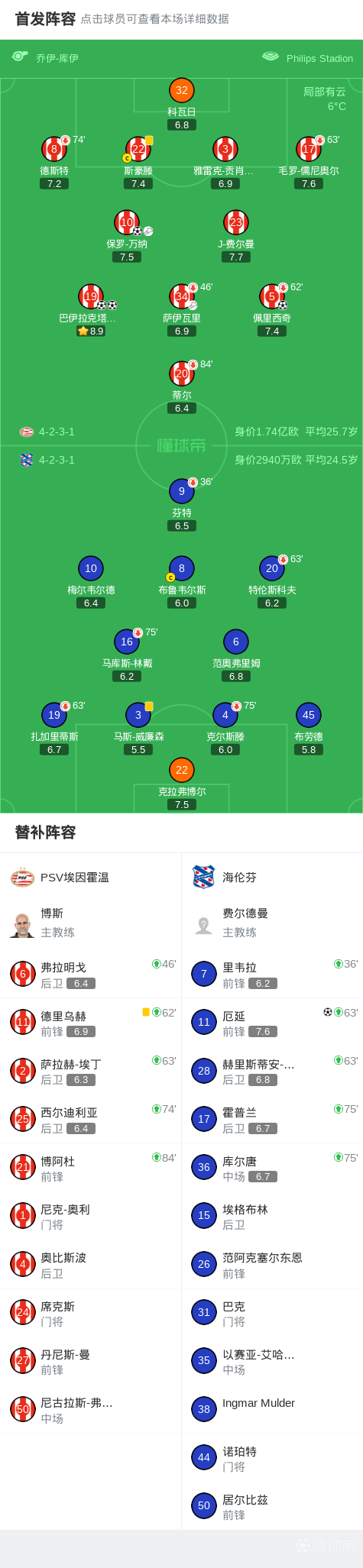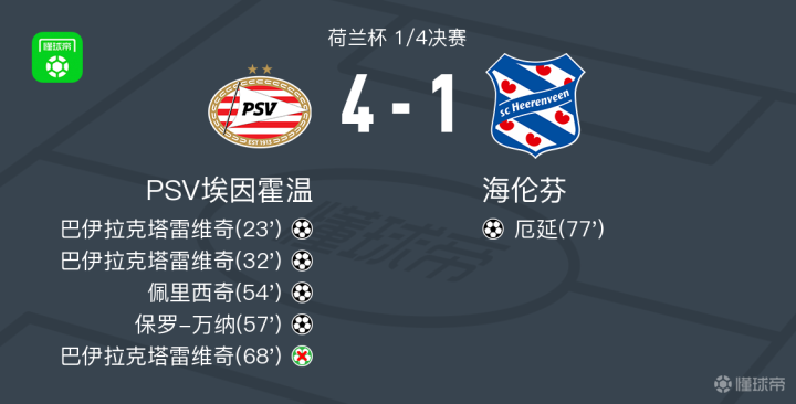 北京时间2月5日荷兰杯 1/4决赛,PSV埃因霍温对阵海伦芬。PSV埃因霍温巴伊拉克塔雷维奇梅开二度,佩里西奇破门,保罗-万纳破门。海伦芬厄延破门。最终比分PSV埃因霍温 4-1 海伦芬。