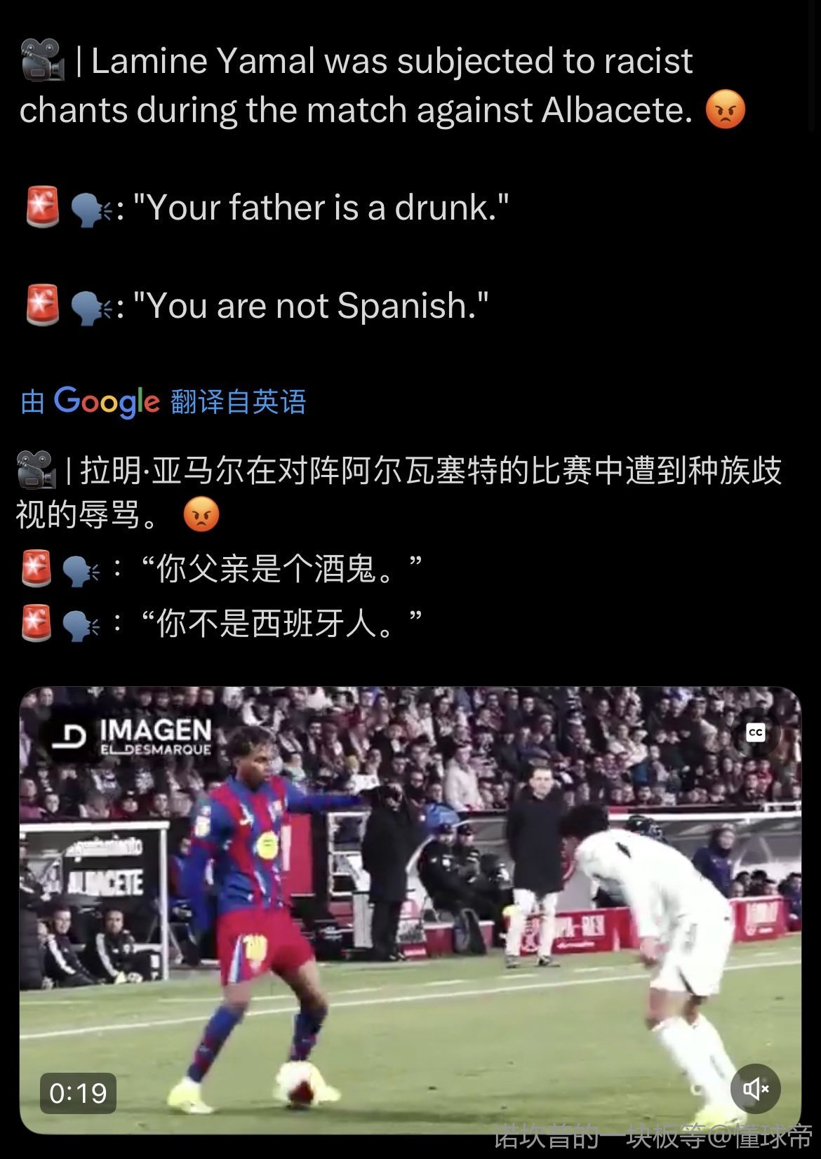 扫描下载懂球帝首页>动态> 阿尔瓦塞特球迷:为啥嘘亚马尔?我嘘他是因为他太出色了