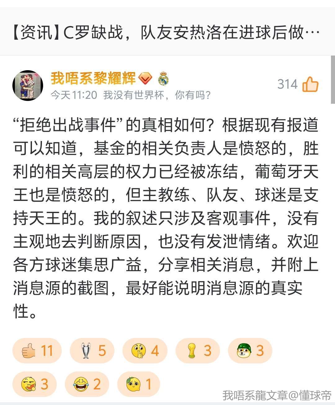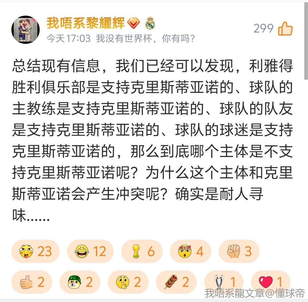 这条信息是提前编辑好的。我在上条评论中指出“俱乐部、主教练、队友、球迷都支持克里斯蒂亚诺”,很多人对此提出质疑,并对我乃至整个球迷群体进行攻击。我相信这些人会守着相关分区的新闻,并长期关注这个事件。现在我在此做出回应,相信你们能看到,也欢迎你们来讨论。我观点的消息源,是俱乐部官方社媒、主教练的具体行动、队友的具体行动、球迷的具体行动,现已把相关报道的例证贴图如下。如果愿意就事论事,并参与讨论,你们可以把观点合依据放在评论区。如果不愿意就事论事,摆事实讲逻辑,仅仅胡搅蛮缠,我不予理睬。希望所有球迷能看到,群众的眼睛是雪亮的。