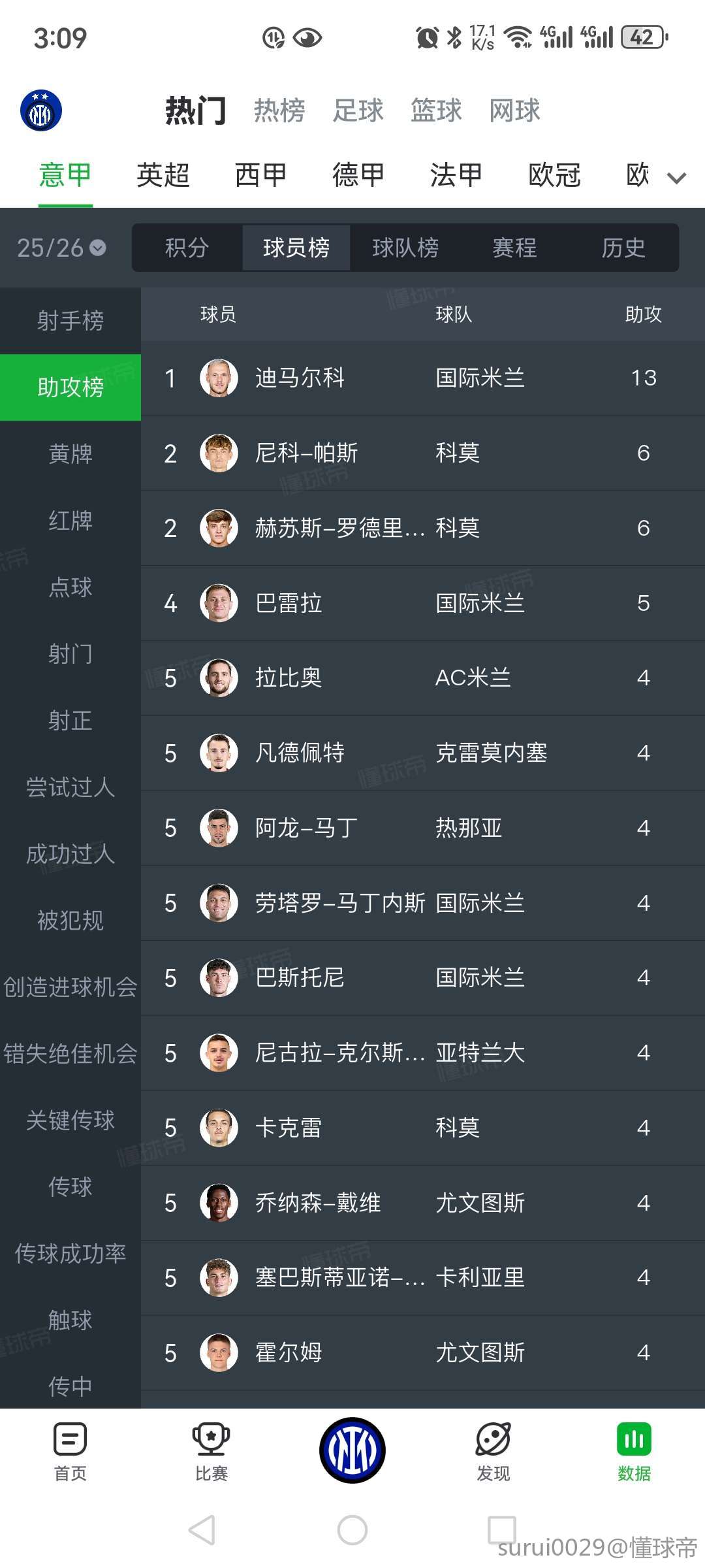 扫描下载懂球帝首页>动态> 门线解围+助攻戴帽,迪马尔科当选国米5球客胜萨索洛全场最佳