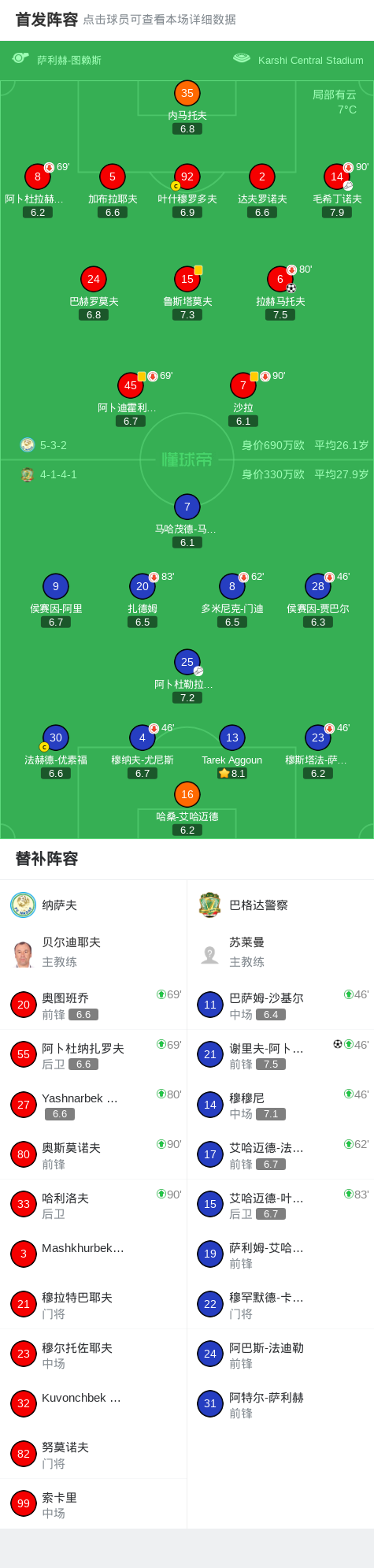 北京时间2月9日亚足联冠军精英联赛 联赛阶段 第7轮,纳萨夫对阵巴格达警察。纳萨夫拉赫马托夫破门。巴格达警察谢里夫-阿卜杜勒卡迪姆破门。最终比分纳萨夫 1-1 巴格达警察。