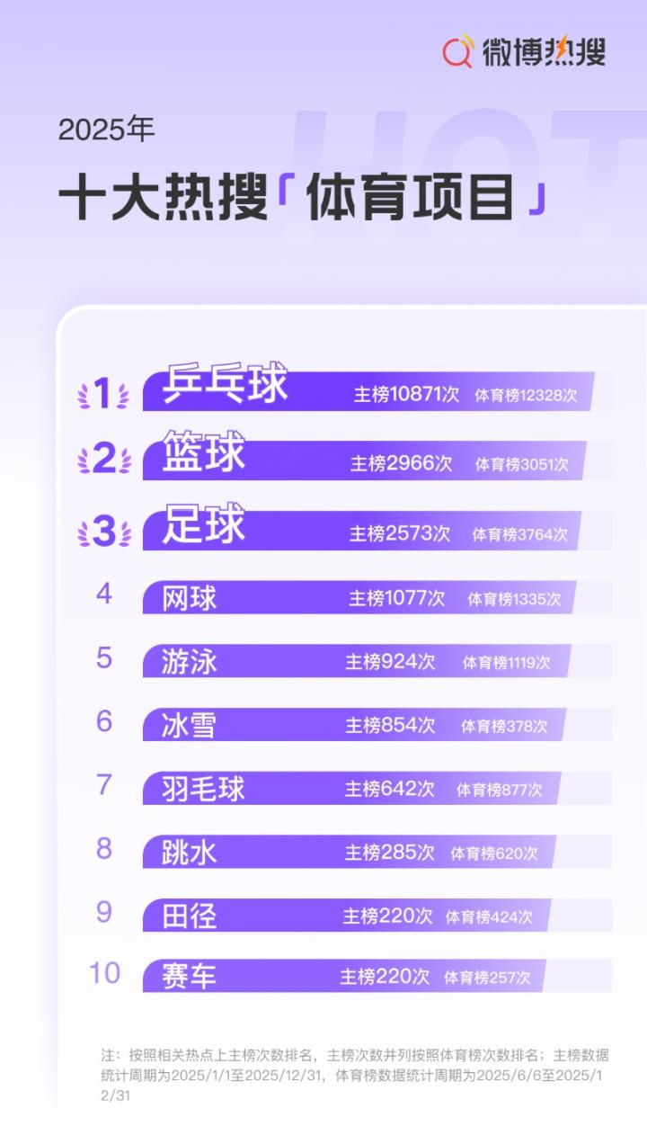 2025年微博体育项目十大热搜:乒乓球断层领先,足球第三