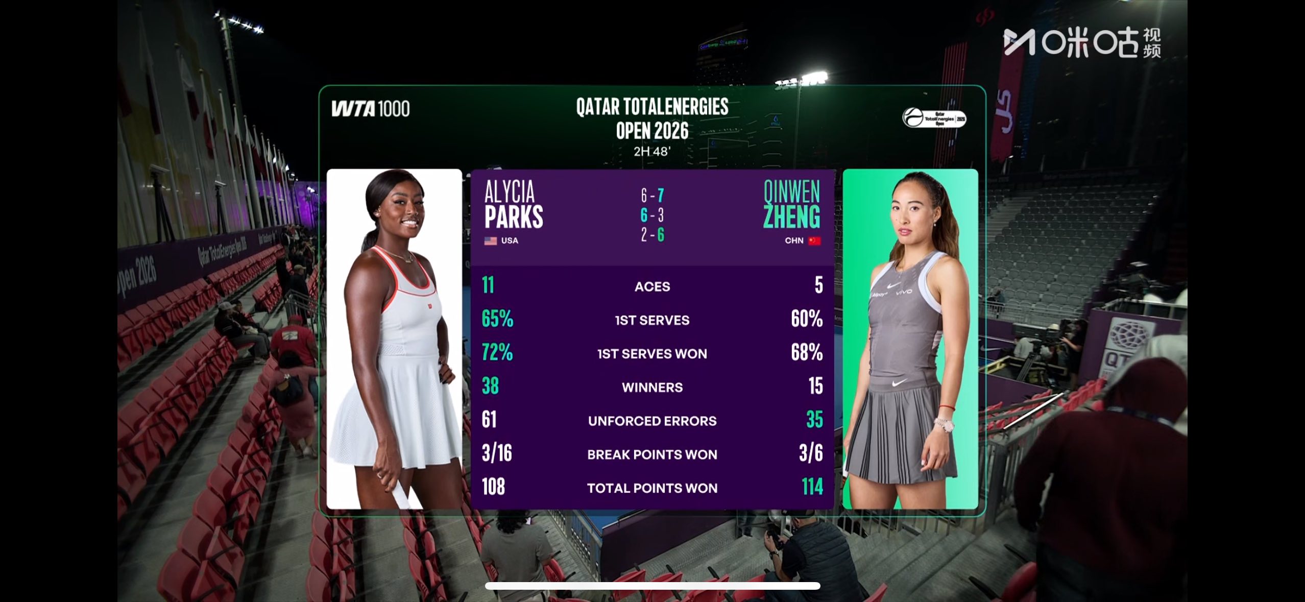 北京时间2月11日,WTA1000多哈站第二轮,郑钦文对阵帕克斯。最终郑钦文7-6(4)、3-6、6-2战胜帕克斯晋级第三轮,下轮将战莱巴金娜。