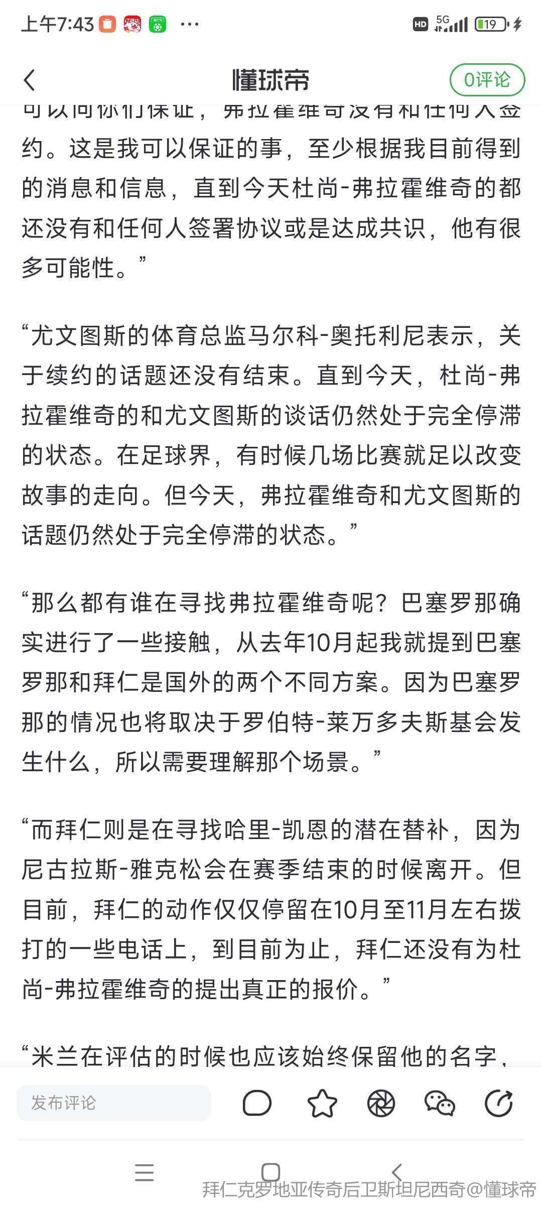 “关于尤文图斯,我们在过去几个小时里收到的许多问题仍然是关于杜尚-弗拉霍维奇的。一位塞尔维亚国家队的体能教练最近在《都灵体育报》上透露,他在过去就已经决定和巴塞罗那签约,甚至有人曾说过他和米兰签约的事。关于杜尚-弗拉霍维奇的,我今天能告诉大家的是,我可以向你们保证,弗拉霍维奇没有和任何人签约。这是我可以保证的事,至少根据我目前得到的消息和信息,直到今天杜尚-弗拉霍维奇的都还没有和任何人签署协议或是达成共识,他有很多可能性。”