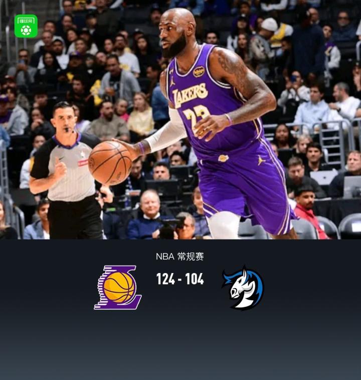 第四节,开节湖人肯纳德、詹姆斯相继得分迅速领先20分,湖人短暂哑火,独行侠布威、华盛顿联手一波8-0追至12分,随后湖人里夫斯、八村垒得分稳住局面,最终湖人124-104战胜独行侠。