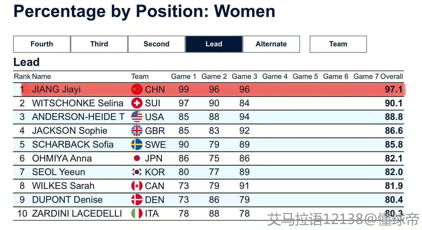 此外,加拿大6-7英国,日本7-5瑞士。中国女壶凭借宝贵的一胜,目前排名第二。
